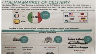 The document presents a marketing strategy for 'Iambrogio,' a delivery service leveraging smartphone technology to expand beyond traditional food delivery. It highlights the significant opportunity in the delivery market, which is still predominantly offline, and details how Iambrogio differentiates itself through innovative services like a concierge feature and AI-driven ordering. The competitive landscape is described as being heavily influenced by venture capital, requiring unique strategies to succeed against established players.