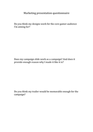 Your designs may not appeal to core gamers, so you ask if the campaign slide effectively presents the campaign and why you designed it this way. You also question whether the trailer would leave a memorable impression for the campaign.