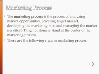The marketing process involves analyzing opportunities, selecting target markets, developing a marketing mix, and managing the effort. It centers around customer needs. Key steps are situational analysis of opportunities; market segmentation; and developing a marketing mix of product, price, place, and promotion. Implementation requires monitoring the market and adjusting the marketing mix as needed to fulfill changing customer needs over time.