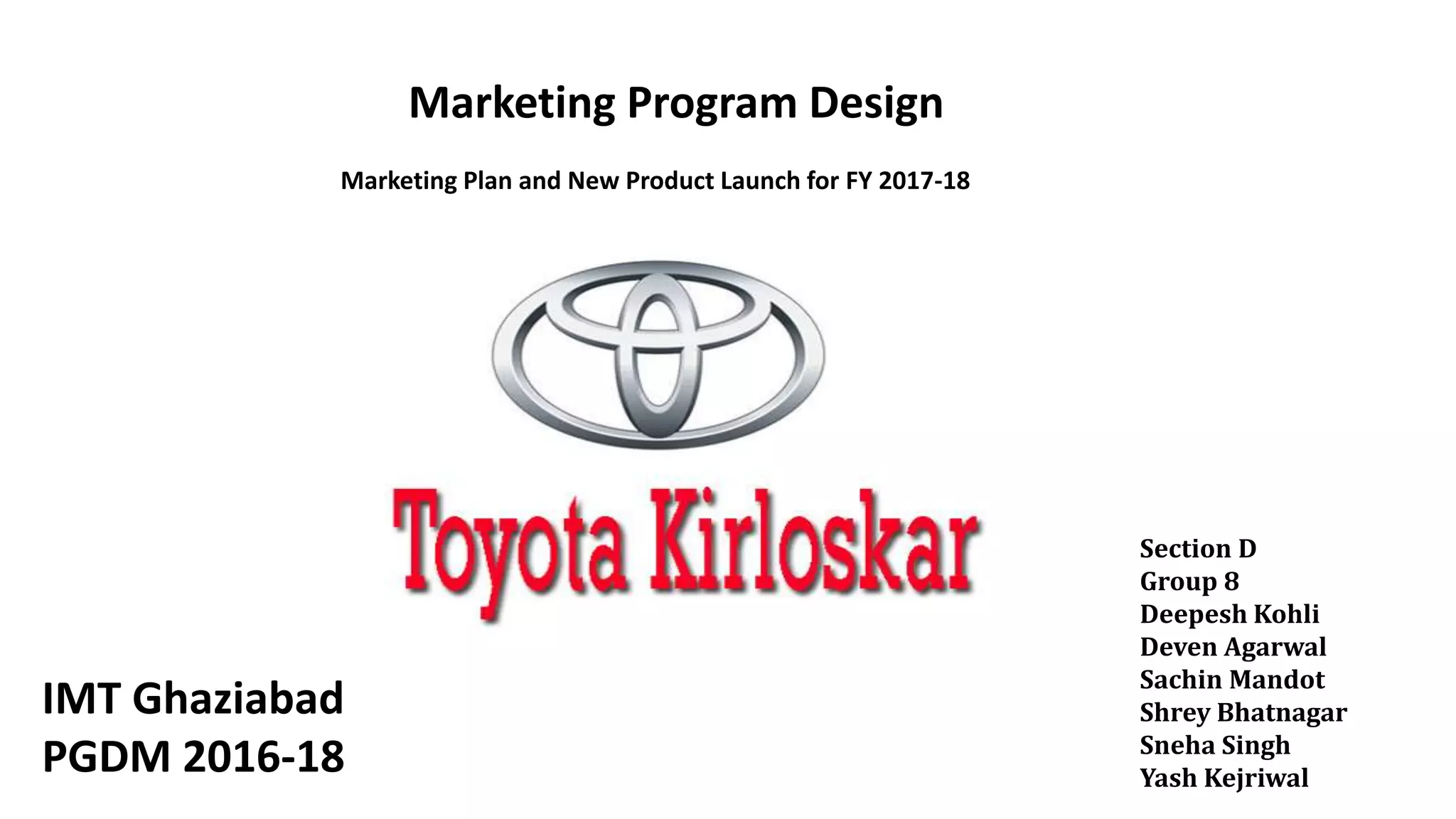 The document outlines a marketing plan for Toyota's new product launch in the Indian passenger vehicle market for FY 2017-18, highlighting market trends, sales performance, and Toyota's competitive positioning. It includes SWOT analysis, target segmentation, and proposed advertising strategies for the Innova Crysta and a new entry-level MUV, the Avanza. Key objectives include increasing sales volume and market share, enhancing social media presence, and expanding the dealer network.