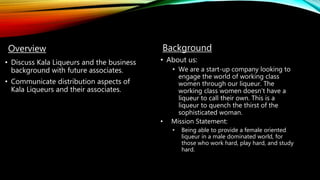 This marketing plan summarizes Kala Liqueurs, a start-up company looking to create a liqueur targeted towards working class women. The plan discusses the background and mission of empowering women, identifies the target segments of working women and female college students, and positions the brand against competitors that target broader audiences. It then outlines the product, pricing, placement, and promotional strategies, including an emphasis on digital marketing through the company website and social media as well as traditional methods. The plan sets revenue goals to reach $3 million in sales within the first 5 years.