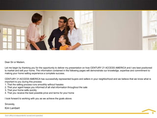 The document provides details on a real estate agent's proposal to market and sell a home. The agent outlines their experience with Century 21 and commitment to making the home selling process smooth and successful. They propose a comprehensive 21 step marketing plan utilizing various online and traditional advertising methods to maximize home exposure and the chances of finding a buyer who will pay the best price. The plan also includes preparing the home for sale and providing feedback during the selling process.