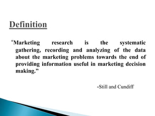 The document defines marketing research as the systematic gathering, recording, and analyzing of data about marketing problems to provide useful information for marketing decisions. It then lists different types of marketing research including product, advertising, motivation, and sales research. The document goes on to describe several specific types of marketing research in more detail such as product research, concept testing, branding research, and advertising research. It also outlines the six main steps of conducting marketing research: defining the problem, situational analysis, informal investigation, formal investigation, data analysis and interpretation, and preparing a written report. Finally, it discusses some limitations of marketing research.
