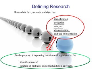 The document discusses research processes and defines research as the systematic identification, collection, analysis, and use of information to improve decision-making. It outlines the typical steps in a research process, including problem definition, developing an approach, research design formulation, data collection, data analysis, and reporting. An example is provided of a study where the researcher failed to properly define the problem, resulting in irrelevant data collection. Proper problem definition is emphasized as the starting point for any successful research project.