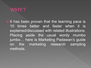 The document discusses various marketing research sampling methods, including random, systematic, stratified, cluster, convenience, judgemental, quota, and snowball sampling. It emphasizes that learning is significantly enhanced when accompanied by illustrations. Additionally, it credits several stock photo sources used in the document.