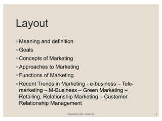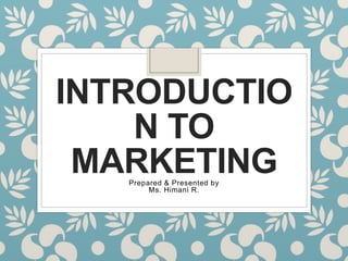 This document provides an introduction to marketing. It defines marketing as a social process of identifying and meeting human needs through the exchange of products and values. The document outlines the key concepts of marketing including the market, marketing goals, traditional and modern approaches, and the 4Ps of the marketing mix. It also discusses recent trends in marketing such as e-business, telemarketing, and customer relationship management.
