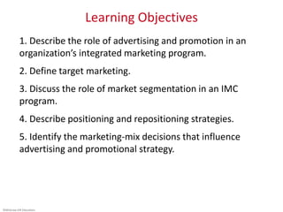 This document discusses integrated marketing communications and the marketing process. It describes how market segmentation, target market selection, positioning, and the marketing mix of product, price, place, and promotion all influence a company's advertising and promotional strategy. The target marketing process involves identifying customer needs, segmenting the market, selecting a target market, and positioning the product.