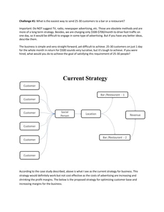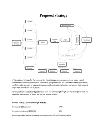 This document discusses strategies for driving 25-30 customers to a bar or restaurant in a month for $500-$700. It suggests focusing initial efforts on acquiring teenage customers by targeting events they celebrate and offering deals. It then proposes expanding to other types of events and allowing direct booking online. It also recommends changing the domain name to something more social and viral, improving the website design, and defining a compelling story for the business. The goal is to not just meet the monthly customer target but build a repeat customer base and recurring business.