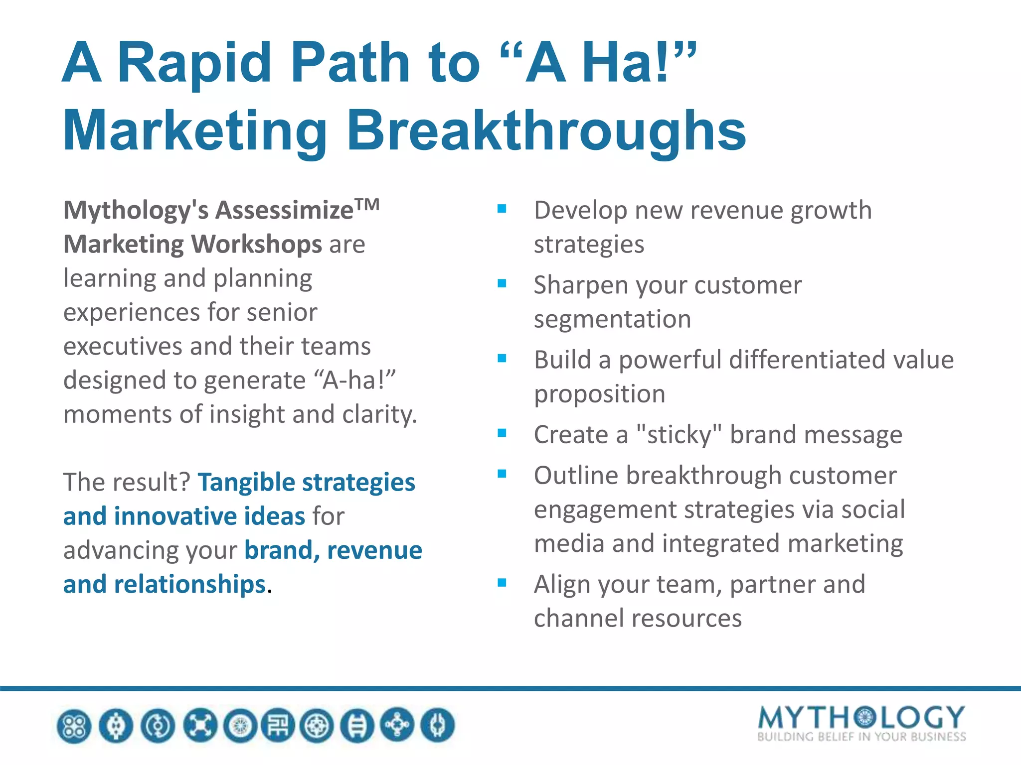 The document describes marketing strategy workshops offered by Mythology to help companies develop strategies for areas such as customer segmentation, branding, and revenue generation. The workshops are facilitated by Jeff James and are designed to generate insights and ideas over the course of a full-day session to help companies advance their marketing plans. Companies will leave the workshop with strategic recommendations and next steps to build out their marketing strategies.
