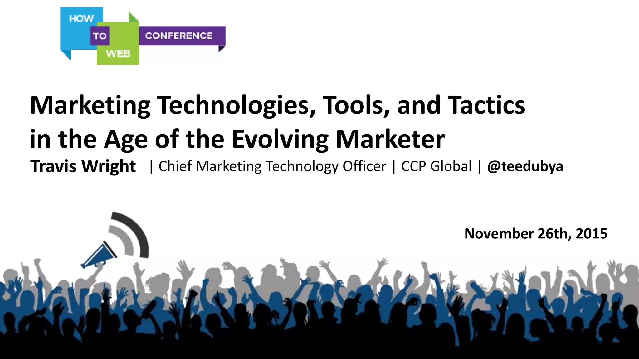 This document provides an overview of marketing technologies, tools, and tactics from Travis Wright, the Chief Marketing Technology Officer of CCP Global. It discusses the growing number of marketing tools available, the importance of collecting and owning customer data across channels, and using tag management and a data layer to integrate tools. It also provides examples of specific technologies and tactics for content marketing, social media, and measurement.