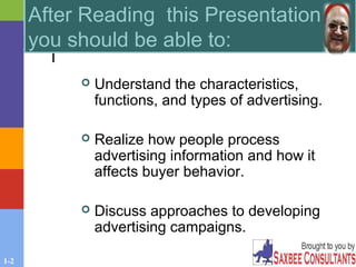 This document provides an overview of advertising and public relations. It discusses the key characteristics of advertising, how people process advertising information, and the different approaches used in developing advertising campaigns. It also outlines how marketers assess advertising effectiveness. Additionally, the document examines the advertising industry and classifications of advertising. It describes the roles of public relations and publicity in marketing communications and the different public relations functions. Finally, it discusses evaluating advertising effectiveness and some of the ethical and legal issues related to advertising.