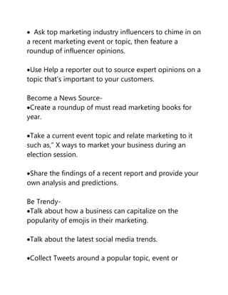 This document provides tips for marketing a business on social media. It recommends identifying your target audience and defining goals and metrics. It also suggests posting engaging content regularly on multiple platforms, interacting with followers, maintaining professionalism, and reflecting your brand identity. The document emphasizes measuring results and developing a unique strategy tailored to each social platform. Overall, it presents best practices for using social media effectively as part of a marketing strategy.