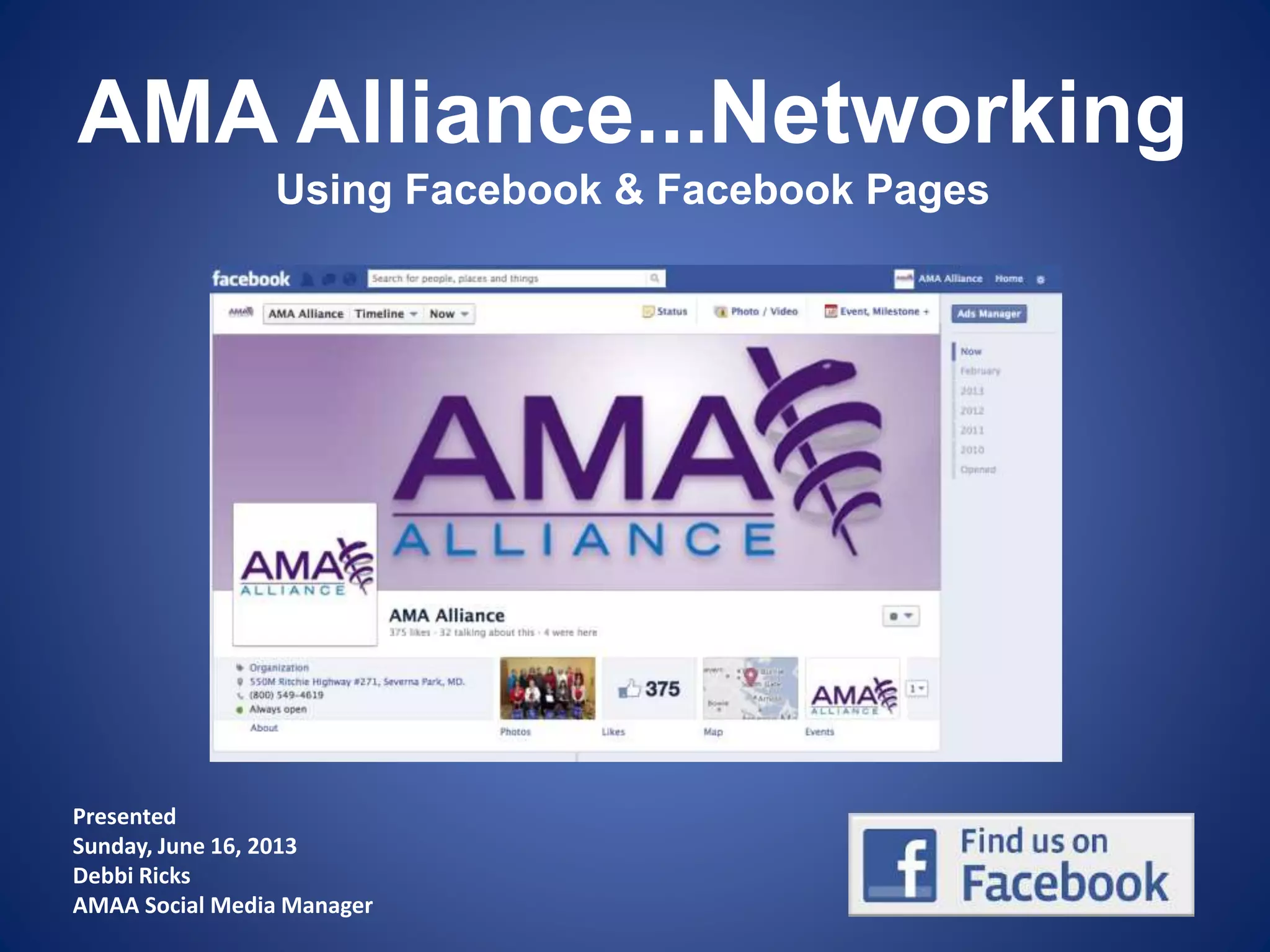 The document outlines the use of Facebook for networking by various medical alliances, highlighting its extensive user base and the functionalities of personal accounts, business accounts, groups, and pages. It emphasizes the importance of creating and managing Facebook pages to foster relationships, share information, and increase visibility, while providing guidelines for content creation and page management. Additionally, it details the specific types of groups and pages associated with different medical alliances across the United States.