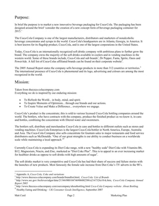This marketing plan document outlines Coca-Cola's strategy for marketing a new innovative beverage packaging in 2015. It provides background on Coca-Cola as the largest manufacturer and marketer of non-alcoholic beverages worldwide. It then performs a SWOT analysis, identifying strengths such as brand recognition, weaknesses such as health concerns, opportunities such as new product introductions, and threats such as substitutes and changing consumer preferences. It also analyzes the political, economic, social and technological factors impacting Coca-Cola through a PEST analysis. The overall purpose is to develop a plan to market a new concept for beverage packaging that will help Coca-Cola continue growing its brand in the future.
