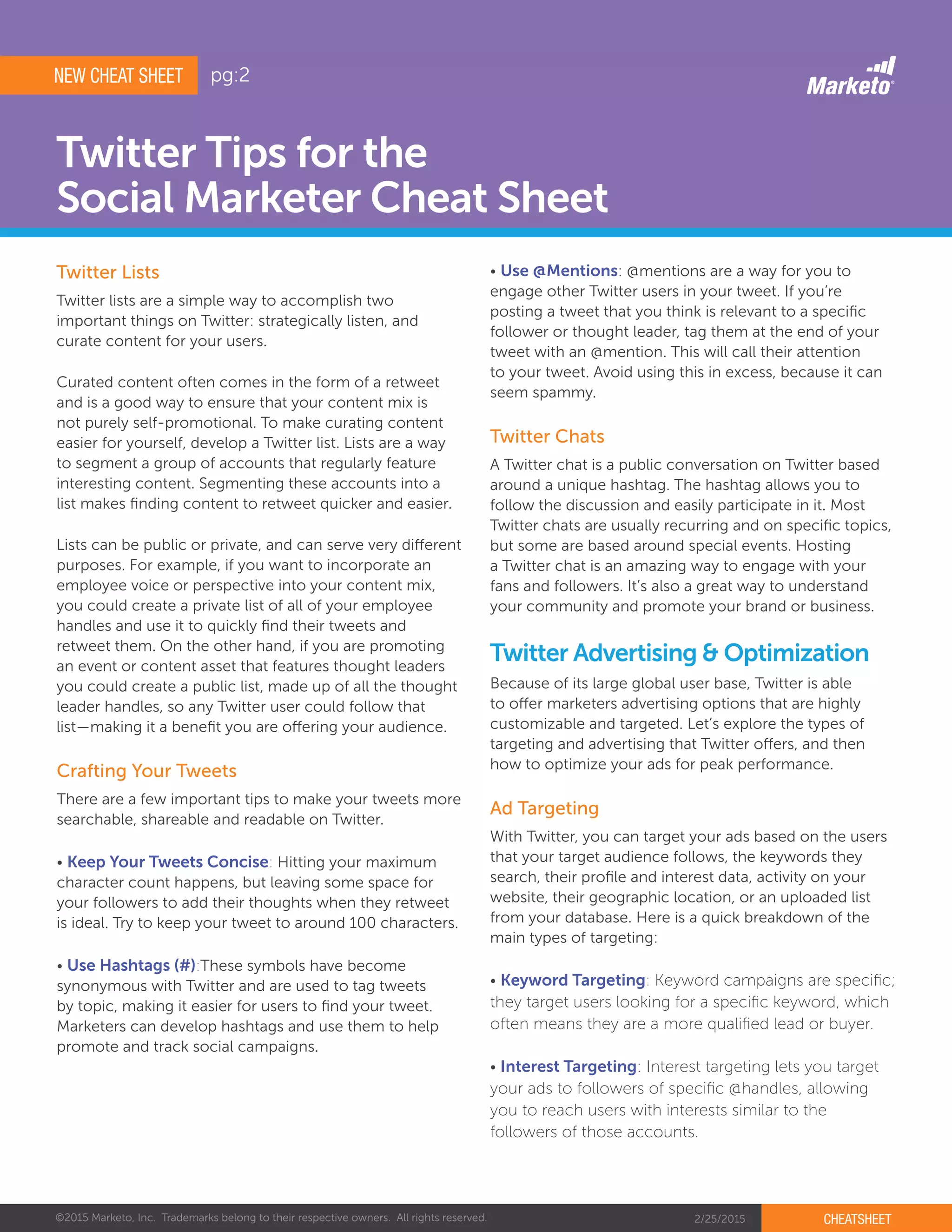 The document provides tips for using Twitter effectively as a social marketer. It discusses how Twitter is an important platform for brands to engage customers and develop relationships. It recommends customizing your Twitter profile, posting engaging content regularly, building your follower base, using hashtags and mentions, creating lists to curate content, hosting Twitter chats, and optimizing different types of Twitter ads including promoted tweets, website cards, and lead generation cards. The goal is to engage audiences and drive leads through a strategic Twitter presence.