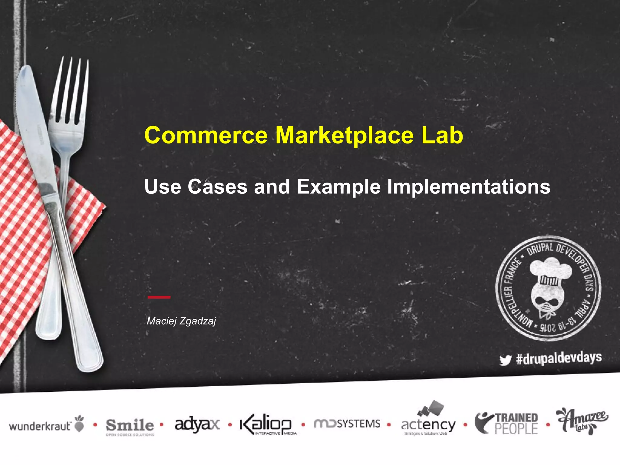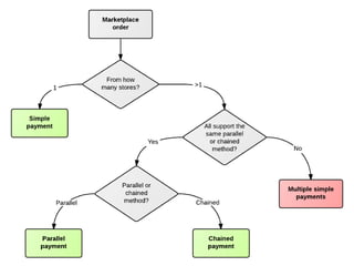 The document discusses implementation use cases for a commerce marketplace using Drupal, highlighting the introduction of a 'commerce_store' entity for vendors. It details various payment flows including single, parallel, chained, and multiple payments, each with specific scenarios and conditions for handling transactions among multiple vendors. Additionally, drawbacks for marketplace owners are noted, including potential complaints and disputes.