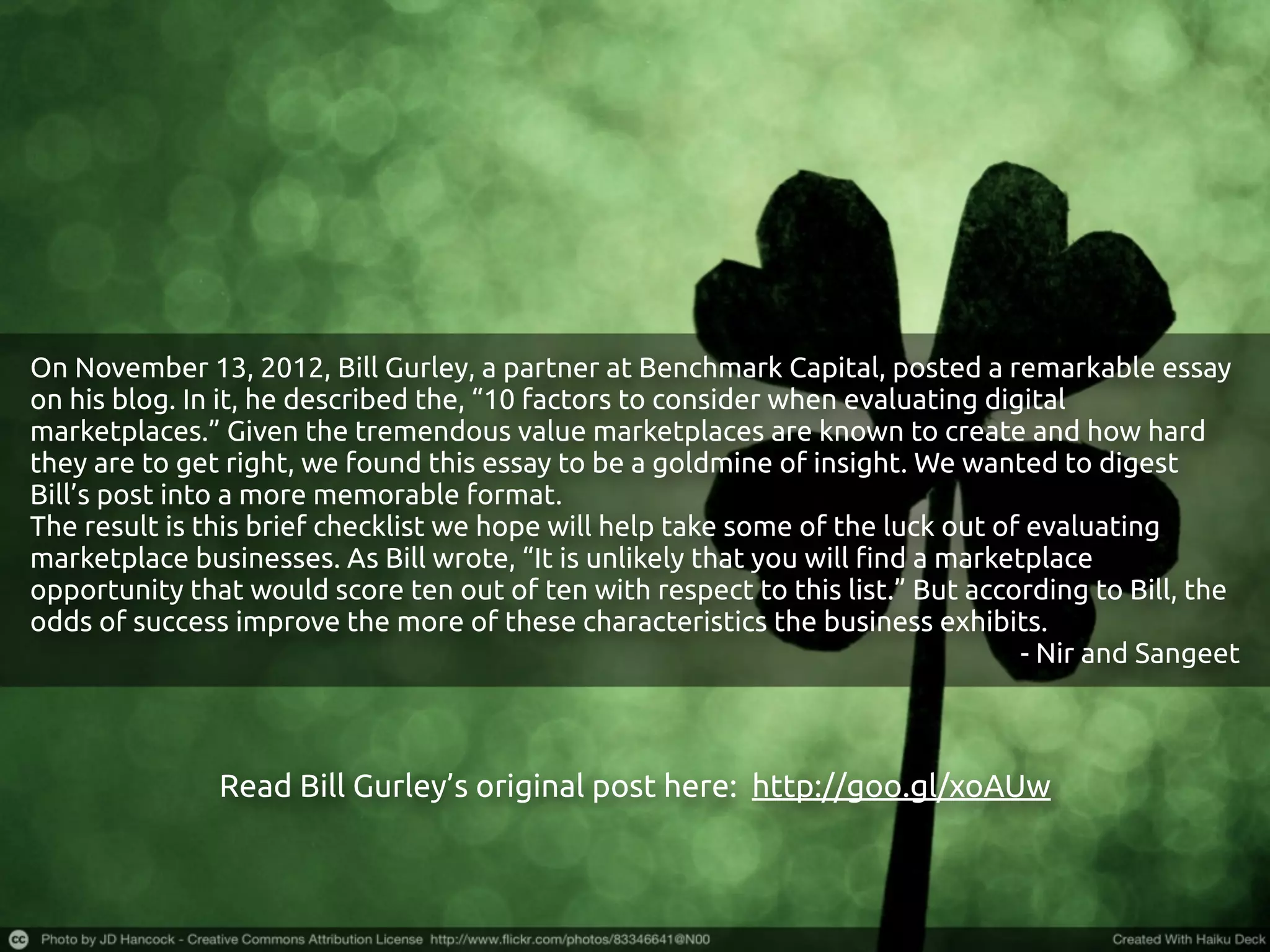 The document presents a checklist based on Bill Gurley's essay outlining ten critical factors for evaluating digital marketplaces. It emphasizes the importance of efficiency, value creation, technology utilization, and market reach among others, suggesting that success is more likely if a marketplace embodies these characteristics. The checklist serves as a guide to help entrepreneurs assess opportunities in the marketplace landscape.