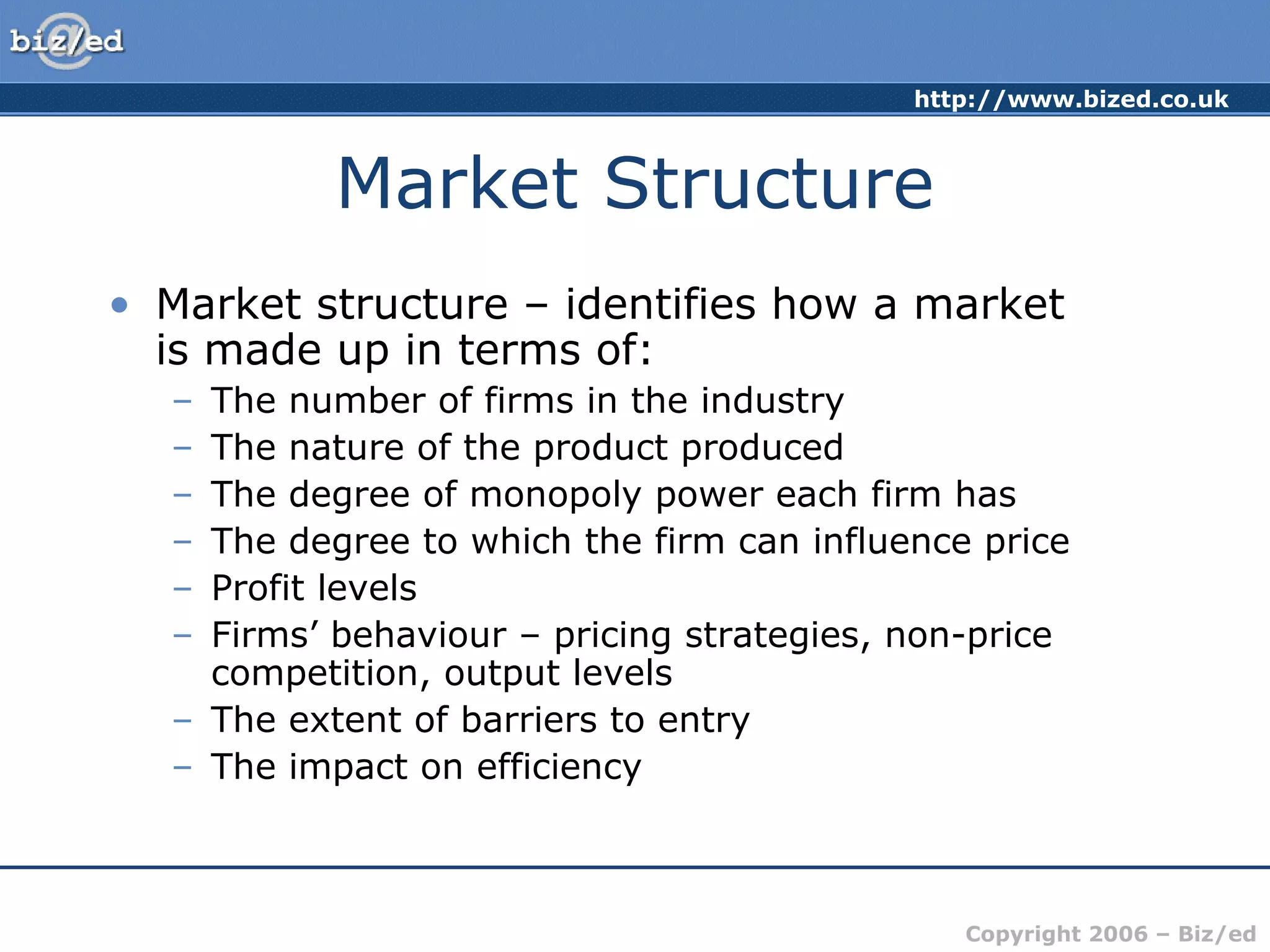The document discusses different market structures, including perfect competition, monopoly, monopolistic competition, and oligopoly. It describes the key characteristics of each structure, such as the number and size of firms, levels of entry and exit barriers, and firms' control over price. Diagrams are presented to illustrate the profit-maximizing output level for firms under perfect competition and monopolistic competition in both the short-run and long-run. A variety of industries like restaurants and plumbers are provided as examples of monopolistic competition.