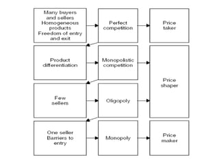 This document provides an overview of market structure and the different types of market structures. It discusses the key factors used to classify market structures, including the number of buyers and sellers, product differentiation, barriers to entry and exit, and level of competition. It then describes the characteristics of four main market structures: perfect competition, monopoly, monopolistic competition, and oligopoly. The document compares the differences between these market structures and provides examples of each. It also discusses price determination in markets and the concept of equilibrium price.