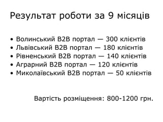 Результат роботи за9 місяців Волинський В2В портал — 300 клієнтів Львівський В2В портал — 180 клієнтів Рівненський В2В портал — 140 клієнтів Аграрний В2В портал — 120 клієнтів Миколаївський В2В портал — 50 клієнтів Вартість розміщення: 800-1200 грн.