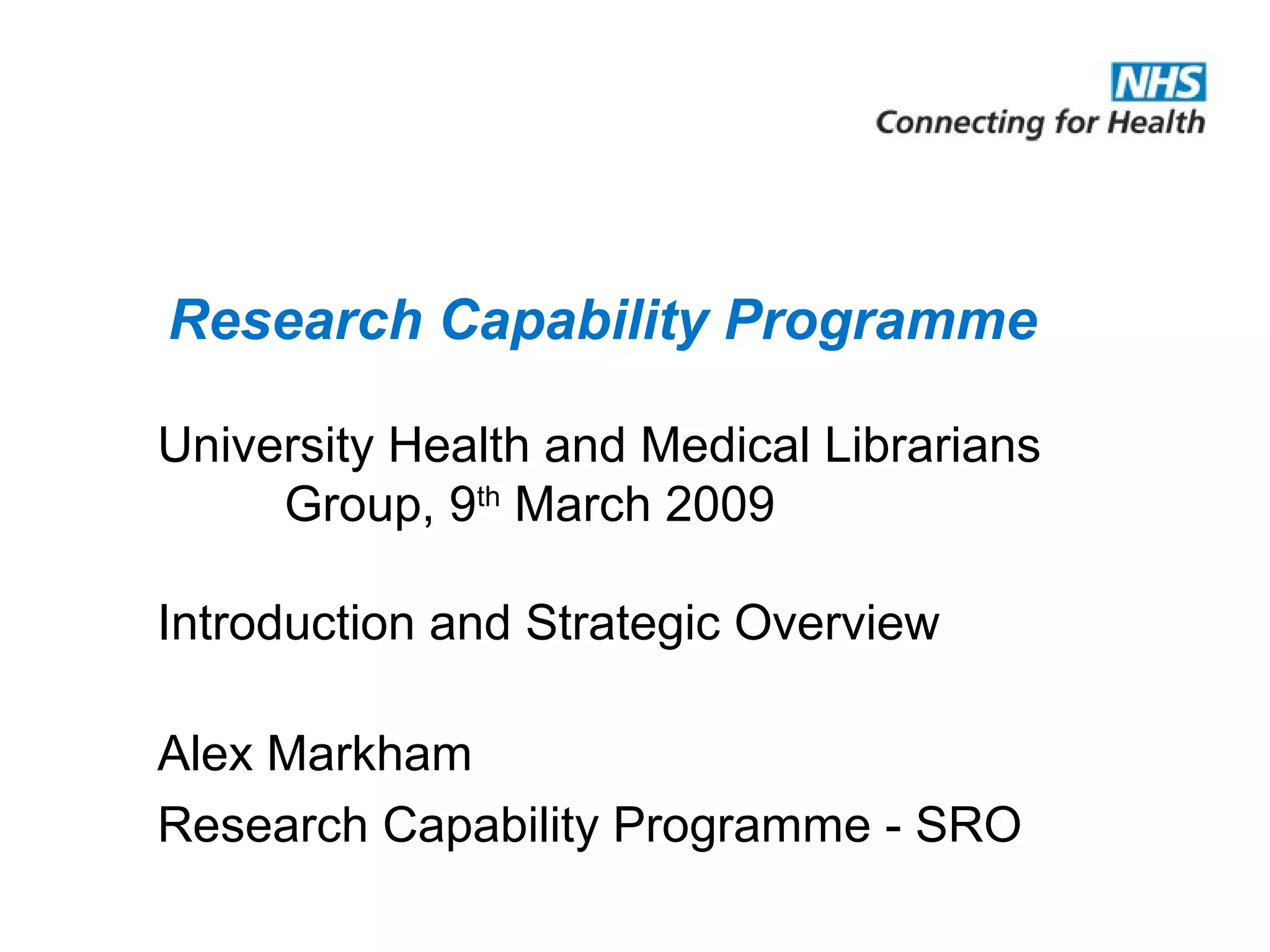 The document provides an overview of the Research Capability Programme (RCP) which aims to enable use of NHS data for research purposes. It discusses the RCP's enabling phase where governance structures and stakeholder engagement were established. The implementation phase will develop infrastructure to provide research support services including access to data sources, cohort management, and anonymization/coding of data. Key challenges include ensuring opportunities are maximized, improving data linkage and quality, and navigating complex information governance issues.