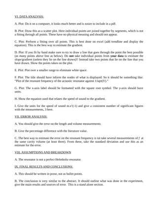 The document provides feedback on improving an experiment to measure the speed of sound using an acoustic resonator. The main results were a measurement for the speed of sound and identification of the main sources of error. Improvements were suggested for the experimental setup sketch, data collection method description, data analysis including a fitted plot of resonant frequency versus the inverse square root of volume, and error analysis. The abstract and conclusions should summarize the experiment, results obtained for the speed of sound measurement, and key sources of uncertainty.