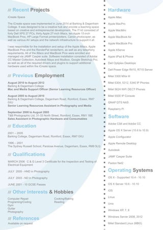 Mark Lake is an IT engineer specializing in Apple OS X and IP Telephony systems. He has 29 years of experience in desktop and server support across Windows, Linux, and Apple operating systems. His current role involves supporting over 100 Mac clients, 30 iOS devices, OS X servers and storage servers, as well as administering a Mitel IP Telephony system of over 300 phones across multiple sites for Barking & Dagenham College. He was responsible for setting up the iCreate space creative hub at the college, which included installing and managing 40 Macs and supporting additional hardware and software.