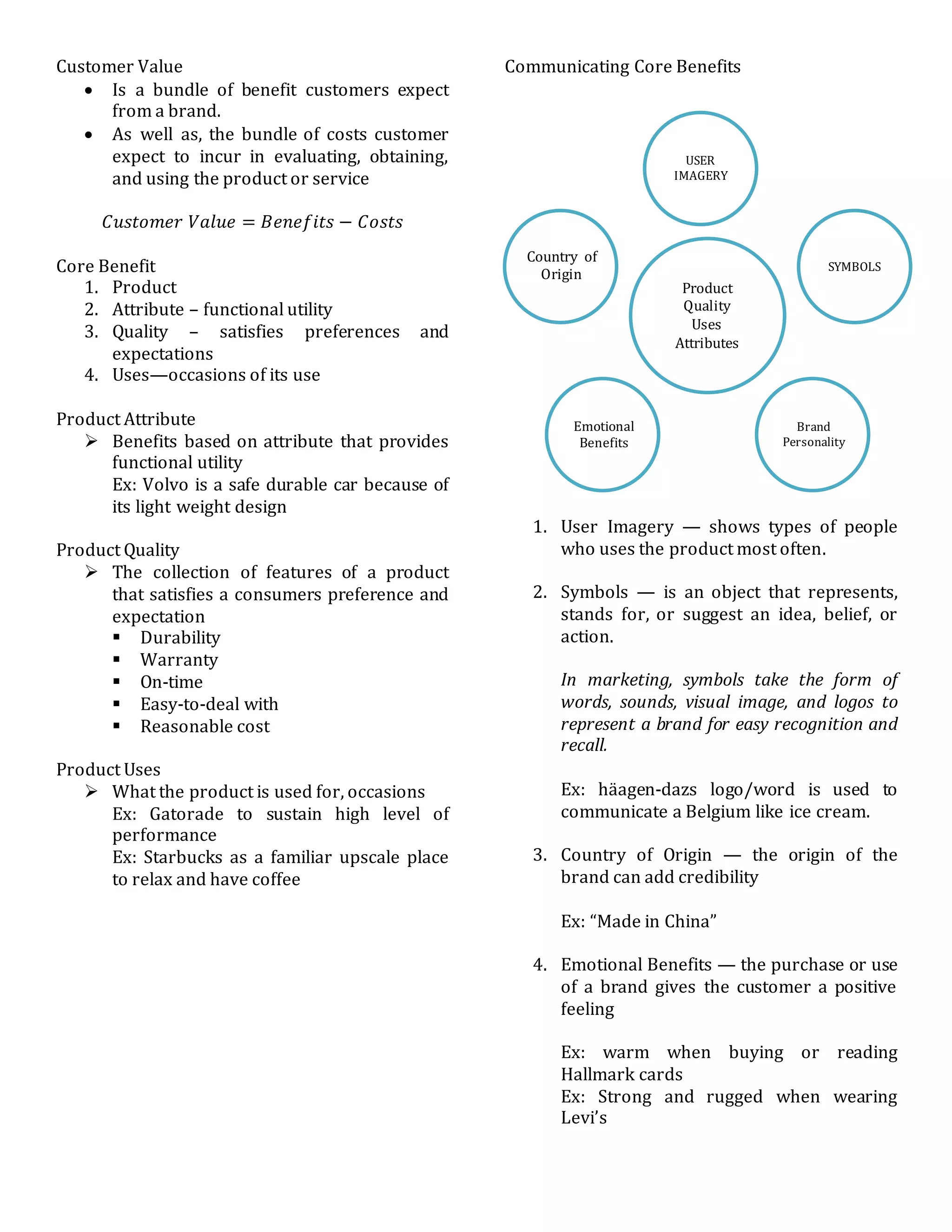 The document discusses customer value and marketing strategies. It defines customer value as the benefits customers expect from a brand minus the costs of obtaining and using the product or service. The core benefits that contribute to customer value are the product's attributes, quality, and potential uses. Marketers can communicate these core benefits through symbols, imagery, country of origin, and appealing to customers' emotional needs. The document also outlines strategies for market penetration, development, and new product development, as well as frameworks for analyzing competition, developing marketing objectives and plans, and forecasting sales.