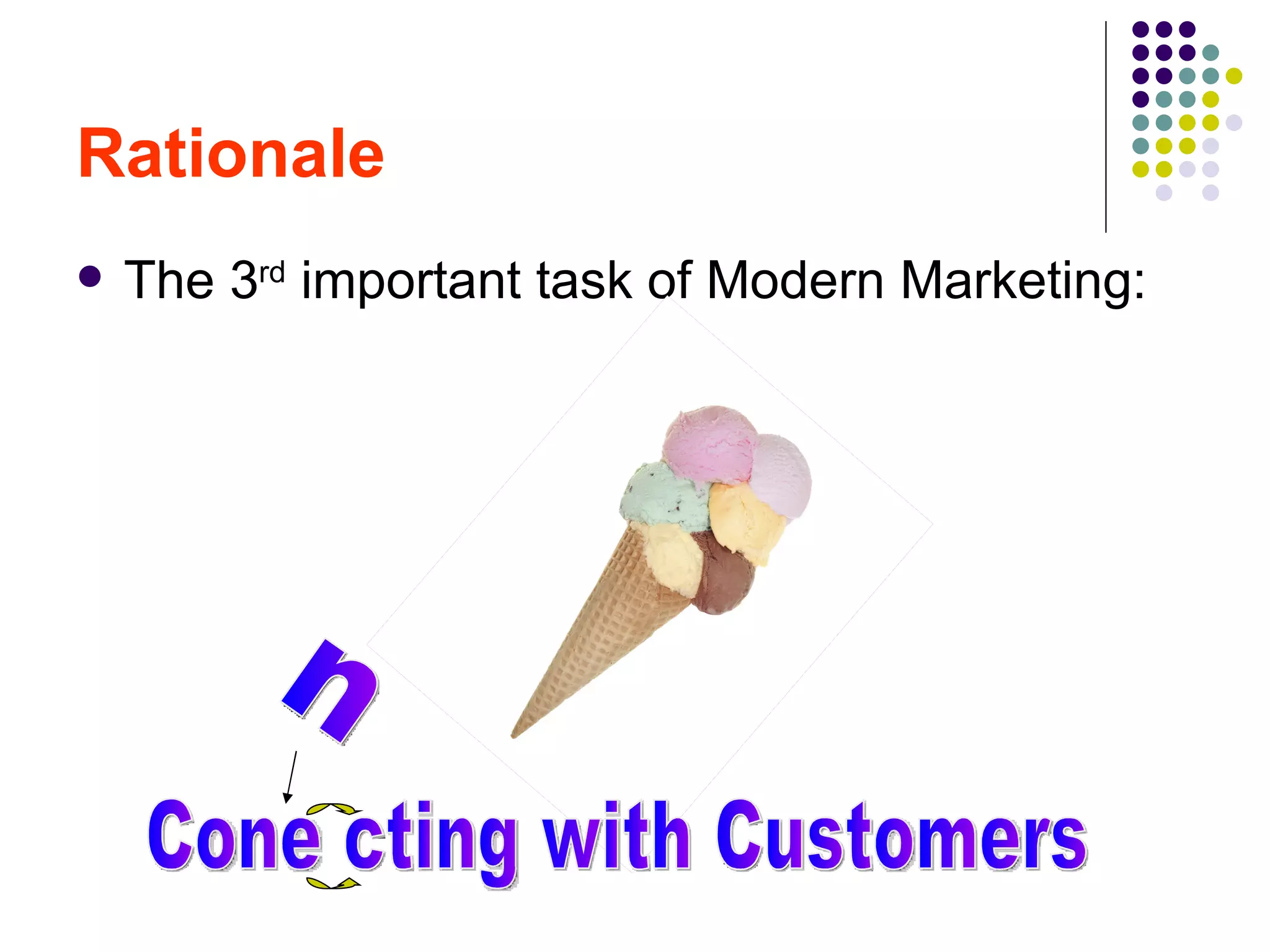 This document discusses connecting with customers through creating customer value, satisfaction, and loyalty. It defines key concepts like customer lifetime value, cultivating strong customer relationships, attracting and retaining customers through database marketing. The goal is to understand how to win customers and beat competition by delivering superior customer value, building customer satisfaction and loyalty through understanding their needs and expectations.