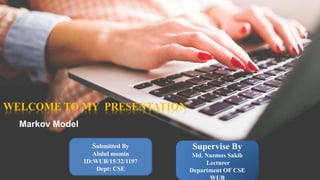 This presentation introduces Markov models. A Markov model is a stochastic method that models randomly changing systems based on transitions between states, where the probability of moving to the next state depends only on the current state, not on past states. There are four main types of Markov models: Markov chains, hidden Markov models, Markov decision processes, and partially observable Markov decision processes. Markov chains work by defining a set of possible states and the transition probabilities between states, such that the probability of moving from the current state to the next state can be determined.