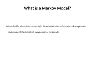 A Markov model is a mathematical modeling technique derived from matrix algebra that describes the transitions a cohort of patients make among a finite number of mutually exclusive and exhaustive health states over a series of short intervals or cycles. In a Markov model, patients are always in one of the defined health states and events are modeled as transitions between states. The contribution of utility to overall prognosis depends on the length of time spent in each health state. Transition probabilities are used to represent the likelihood of moving between states in each cycle. An example Markov model was provided to demonstrate these concepts.