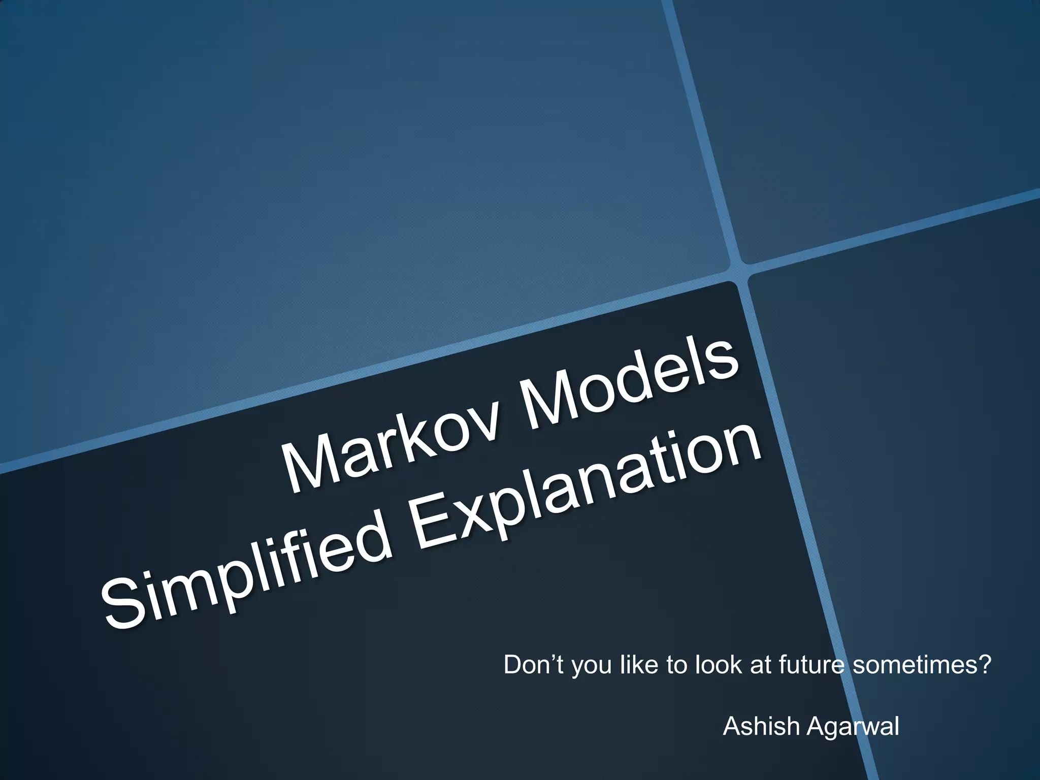The document discusses Markov models, which are mathematical models used to predict dependent random events based on previously observed events. Specifically, it provides an example of using a Markov model to predict tomorrow's weather based on today's weather. Key aspects covered include the definition of a Markov process, examples of Markov and non-Markov systems, and calculating the probability of future weather events given the current weather.