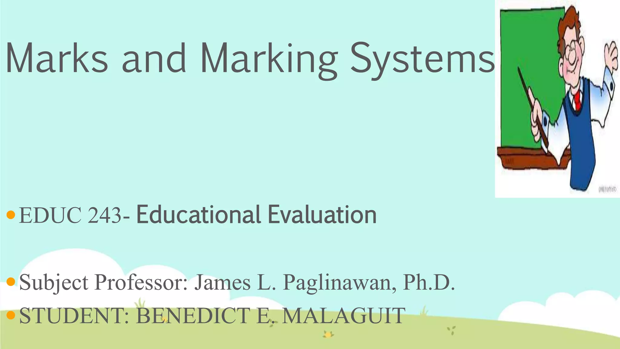 2. Various marking systems exist that compare student performance to other students, established standards, aptitude, effort, or improvement. Comparing to established standards best reflects academic achievement.