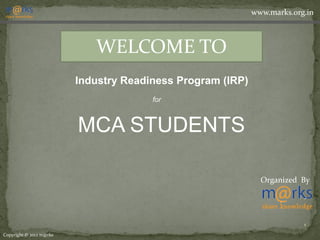 The document outlines the Industry Readiness Program (IRP) organized by Marksman Technologies for MCA students, designed to provide real-time work experience through live projects. It details the program structure, selection process, and training phases, emphasizing industry relevance and skill enhancement. The IRP aims to strengthen students' competence in technology application and improve their employability in the IT sector.