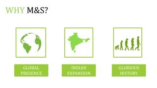 This document discusses Marks & Spencer's (M&S) expansion into India. It provides background on M&S' global presence and glorious history dating back to 1884. The document analyzes the political, economic, social and technological factors in India and conducts a SWOT analysis. It also includes a market analysis of Indian consumers that found most are aged 19-25 and prefer shopping at Pacific Mall for its store layout and high quality product variety. In conclusion, the document outlines the team that created the report.