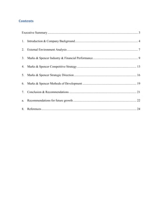 The report analyzes the strategic position of Marks & Spencer, highlighting its strong market presence as a leading UK retailer, particularly in women's wear and lingerie. Key analyses include a PESTLE review of external factors affecting the business, a competitive strategy evaluation, and financial performance metrics revealing low growth in a challenging retail environment. It concludes with recommendations for future growth and a commitment to sustainability through its 'Plan A' initiative.