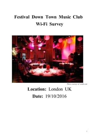 The document proposes installing WiFi access points at a music venue to improve coverage and allow customers to upload photos and videos to social media. A site survey was conducted to identify appropriate access point locations. Three access points will be installed, one each in the seating area, VIP area, and bar area. The access points will operate on both 2.4GHz and 5GHz channels to provide coverage for up to 300-400 people without interference. Security measures like WPA2 encryption will be implemented to secure the network. The installation is expected to take 5-10 days and will provide improved WiFi access across the venue.