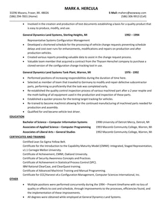 Mark Hercula has over 20 years of experience in embedded software development for defense projects. He has strengths in software configuration management, process development, documentation, and understanding standards like ISO and CMMI. He currently works as a Senior Software Engineer, and has experience in roles such as Documentation Lead, ClearQuest Administrator, and Metrics Analyst. He aims to continuously improve processes and ensure high quality, on-time delivery of software and documentation.