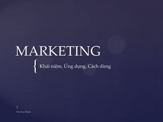 Tài liệu trình bày khái niệm và ứng dụng của marketing trong kinh doanh, bao gồm quy trình quản trị marketing cơ bản như nghiên cứu, phân đoạn thị trường, thị trường mục tiêu, định vị, sản phẩm, giá cả, phân phối và xúc tiến. Nó nhấn mạnh tầm quan trọng của việc định nghĩa marketing và cách mà các công ty có thể áp dụng những chiến lược marketing hiệu quả để đáp ứng nhu cầu khách hàng và đạt được lợi nhuận. Tài liệu cũng đưa ra các bài tập và hoạt động nhóm để giúp người học hiểu rõ hơn về các khía cạnh của marketing trong thực tiễn.