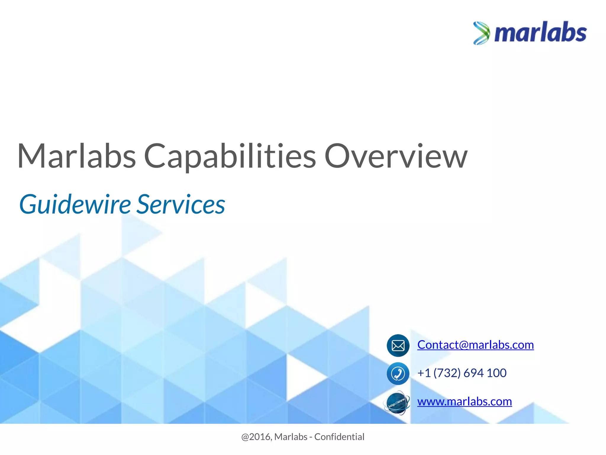 Marlabs is a global consulting and software services provider founded in 1996, with over 2,100 employees and 100+ blue-chip clients across various industries. The company operates from multiple locations, including headquarters in Piscataway, NJ, and a global development center in Bangalore, India, and is certified at CMMI Level 5 and ISO/IEC 27001:2013. Marlabs specializes in application development, testing, IT infrastructure services, and has developed a suite of services focused on the insurance sector, particularly utilizing Guidewire technology.