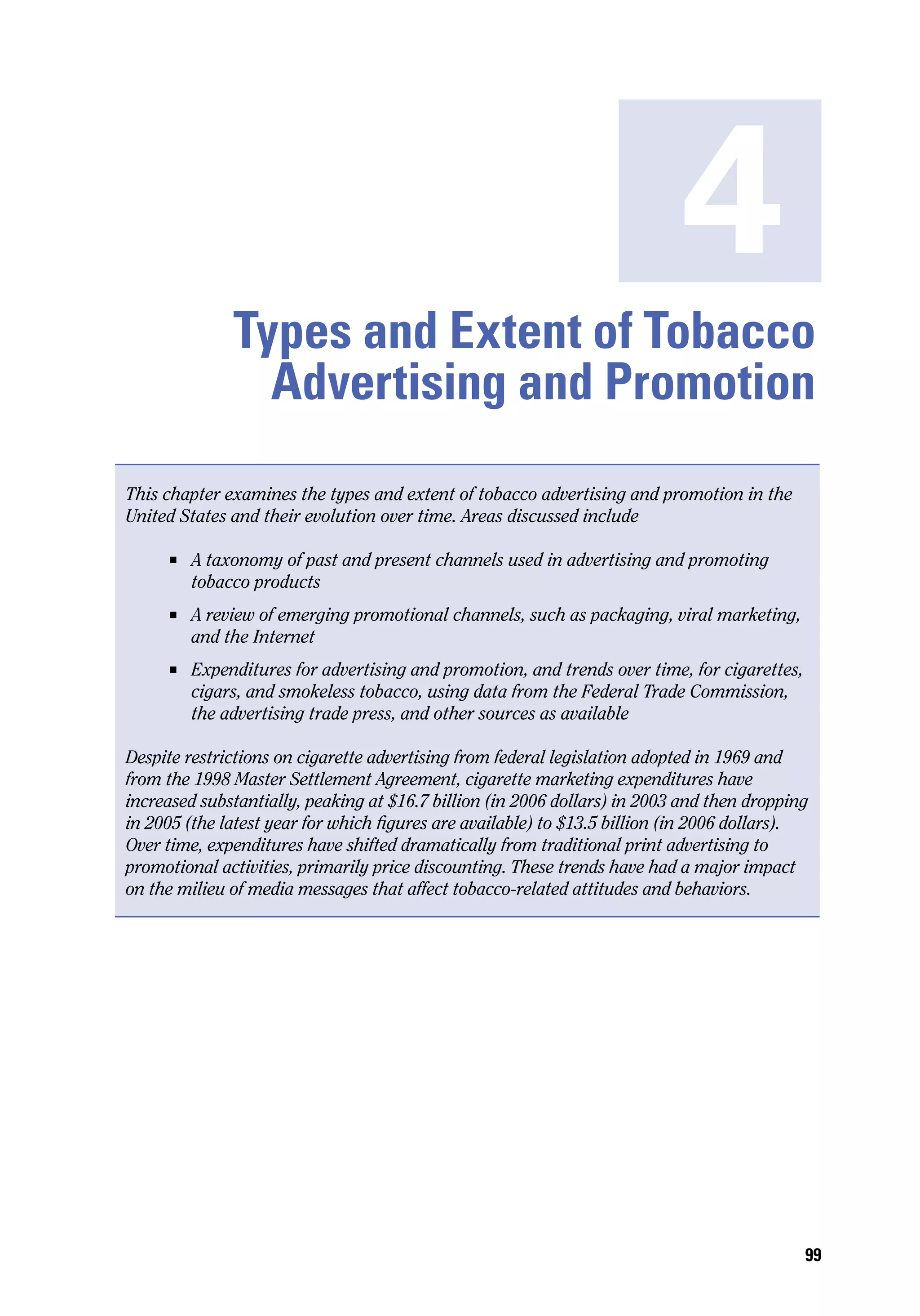 This chapter examines types and extent of tobacco advertising and promotion in the US over time. It discusses advertising channels used historically and emerging channels like packaging and the internet. It reviews trends in expenditures for cigarettes, cigars, and smokeless tobacco. Despite restrictions, cigarette marketing spending increased substantially to $16.7 billion in 2003, then dropped to $13.5 billion in 2005. Over time, spending has shifted from print to promotional activities like price discounts, impacting exposure to marketing messages.