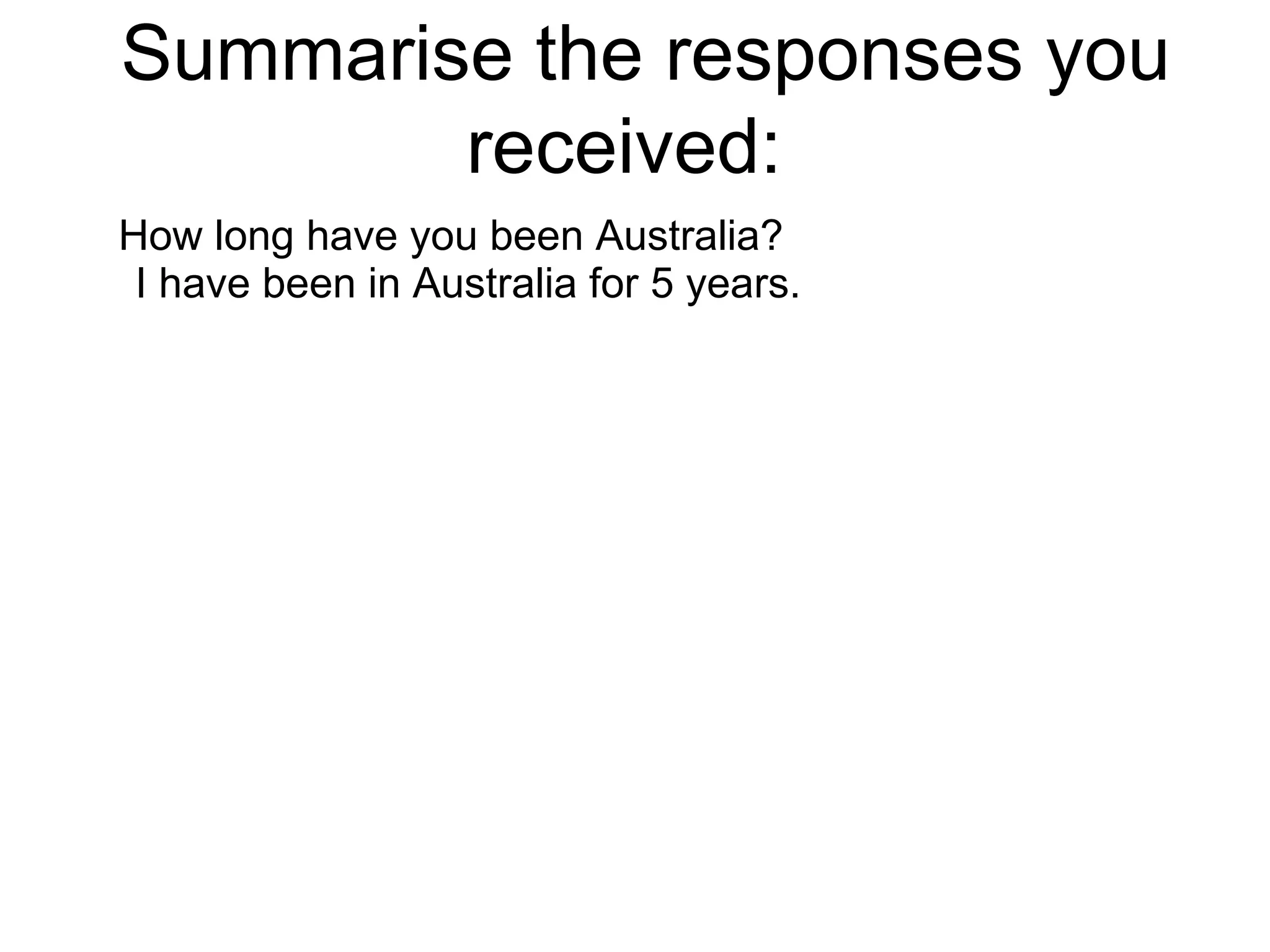 The document summarizes responses from an individual who migrated to Australia 5 years ago from another country by airplane. Upon arriving, they felt worried about experiencing a new life. While information about education was provided, other questions remained unanswered. With support from the government and by asking more questions, the experience of settling could be improved for new migrants and refugees.