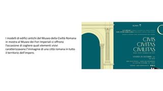 Il documento descrive una mostra al Museo dei Fori Imperiali che espone modelli di edifici antichi, evidenziando le caratteristiche architettoniche delle città romane. Attraverso vari esempi, come il Tempio di Giove e la Basilica di Pompei, si analizzano le influenze culturali e decorative nel corso del tempo. Inoltre, si sottolinea come queste architetture riflettano la monumentalità e l'autorappresentazione della società romana e delle sue élite.
