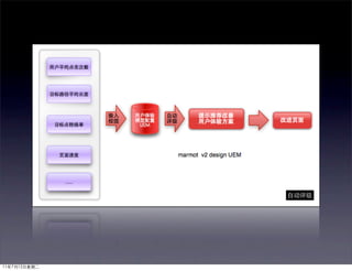 The document discusses the user behavior tracking system named Marmot, detailing its interaction with web technologies such as DOM, PHP, and HTML5. It outlines key functionalities including event logging for user actions like clicks and mouse movements, as well as A/B testing capabilities. The document also references paths for input fields and buttons relevant to user interaction monitoring.