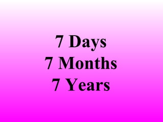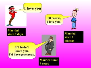 This document discusses the changes that can occur in a marriage over time. It contrasts the feelings of newly married couples after 7 days of being married with couples married for 7 months and 7 years. For newly married couples, there is an expression of love, but after 7 months small disagreements emerge around communication and purchases. By 7 years of marriage, deeper understanding and compromise have developed, but other interests like sports also become a priority.