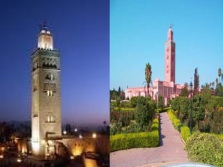 Marrakech, Morocco is known as the "Red City" and has a population of over 1 million people. It was founded in 1062 by the Almoravids dynasty and served as the capital of Morocco for nearly two centuries. The old walled medina contains several Moorish-style palaces and the famous Koutoubia Mosque and minaret. Marrakech has a hot desert climate and receives tourists drawn by its markets, handicrafts, and historic sites.
