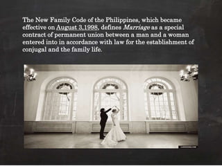The Family Code of the Philippines, effective August 3, 1998, defines marriage as a special contract between a man and a woman for establishing a conjugal and family life, emphasizing its legal, religious, and social dimensions. It outlines essential and formal requisites for a valid marriage, including legal capacity, consent, and the presence of a solemnizing officer, along with various articles detailing procedures for marriage licenses and ceremony requirements. Additionally, it addresses matters such as parental consent, marriage counseling, and the validity of marriages conducted outside the Philippines.