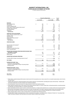 Marriott International reported higher revenues and net income for the 12 and 24 week periods ending June 15, 2007 compared to the same periods in 2006. Revenues increased 11% and net income grew 11% for the quarterly period. For the half year, revenues rose 9% and net income increased 57%, which included the impact of a prior accounting change. Higher revenues were driven by increased rates across all lodging segments and timeshare sales.