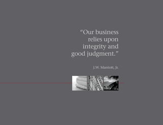 The document outlines Marriott's commitment to integrity and ethical business conduct, emphasizing accuracy in record keeping, fair dealings with customers and competitors, and compliance with all applicable laws. It provides guidance to ensure decisions made on behalf of Marriott uphold the company's values and protect its reputation as a global hospitality leader known for service and integrity. The Business Conduct Guide applies to all Marriott associates and is intended to help them make the right decisions every day.