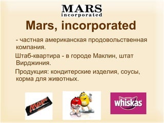 Mars, Incorporated — это частная американская продовольственная компания, основанная в 1911 году и расположенная в Маклине, Вирджиния. Основные направления деятельности компании включают кондитерские изделия, корма для домашних животных и продукты питания, при этом кондитерские изделия составляют 50% продаж. В 2008 году Mars приобрела компанию Wrigley за $23 миллиарда.
